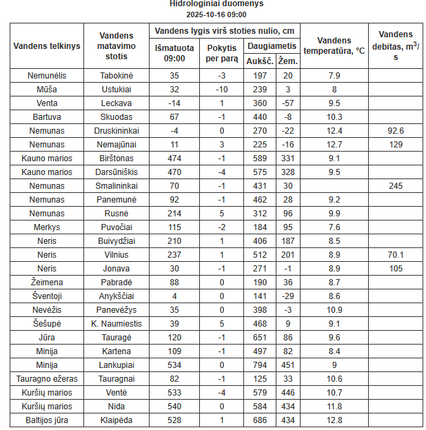 Operatyvi hidrologijos tinklo informacija (dar neįvertinus duomenų patikimumo). Oficialią informaciją galima gauti Lietuvos hidrometeorologijos tarnybos Hidrologinių stebėjimų skyriuje.