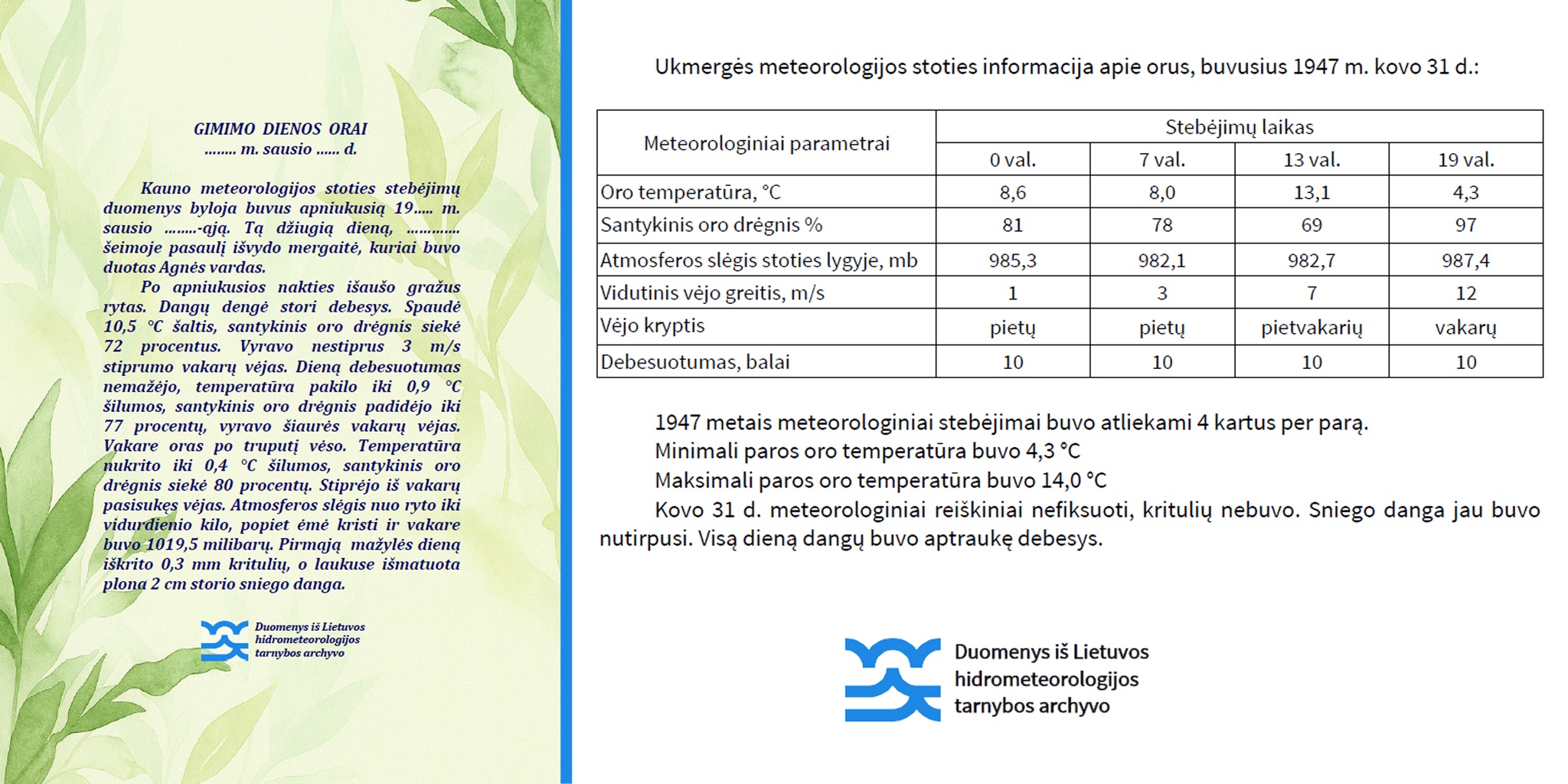 Rekomenduojame išbandyti paslaugos.meteo.lt platformą ir užsisakyti savo, draugo arba giminaičio „Svarbios datos“ paslaugą (tinka: gimtadienis, vestuvių sukaktis, darbo jubiliejus, kitas jums svarbus įvykis). Užsisakę gausite detalų jūsų pasirinktos dienos tuo metu buvusių orų sąlygų aprašymą, kurį vėliau galėsite įsirėminti bei padovanoti Jums brangiam žmogui. 🎁
