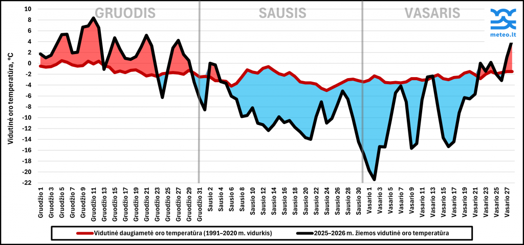 1 pav. 2025–2026 m. žiemos vidutinė oro temperatūra (juoda kreivė) ir 1991–2020 m. (raudona kreivė) laikotarpio Lietuvoje. Raudona spalva rodo šiltesnius, o mėlyna – šaltesnius už daugiametį vidurkį laikotarpius.