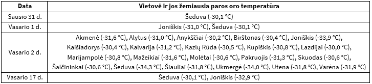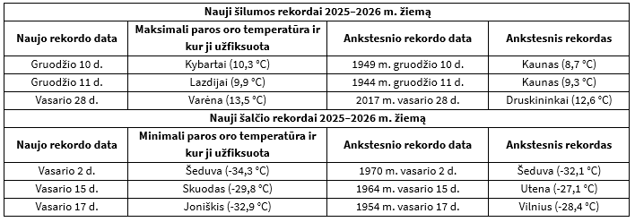 2 lentelė. Paros oro temperatūros rekordai, registruoti 2025–2026 m. žiemą.