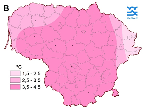 1 pav. Gruodžio mėnesio pirmojo dešimtadienio vidutinė oro temperatūra (A) ir nuokrypis nuo SKN (B)