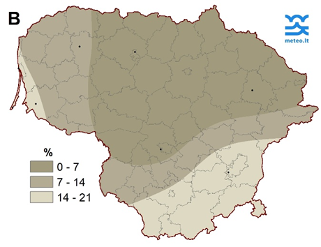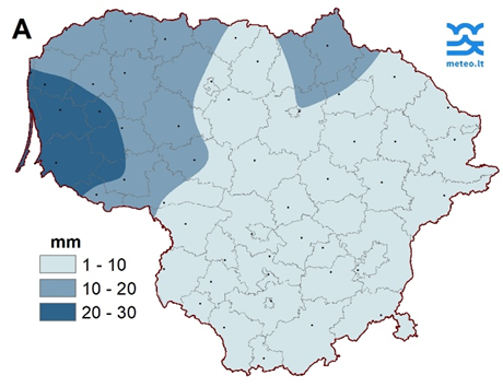2 pav. Gruodžio mėnesio pirmojo dešimtadienio kritulių kiekis (A) ir nuokrypis nuo SKN (B)