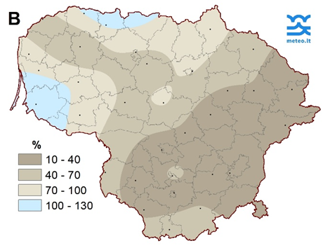 Pirmąjį gruodžio dešimtadienį vidutinis kritulių kiekis Lietuvoje buvo 10,8 mm (64 % SKN) (2 pav.). Mažiausiai kritulių registruota Vilniuje – 2,6 mm, daugiausiai Šilutėje – 29,4mm.