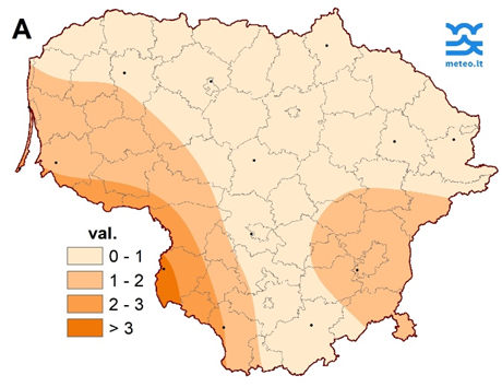 Vidutinis Saulės spindėjimo laikas Lietuvoje buvo 1,1 val. (vos 10 % nuo SKN). Biržuose Saulė nešvietė visai, ilgiausiai ji spindėjo Kybartuose – 3,2 val. (3 pav.).