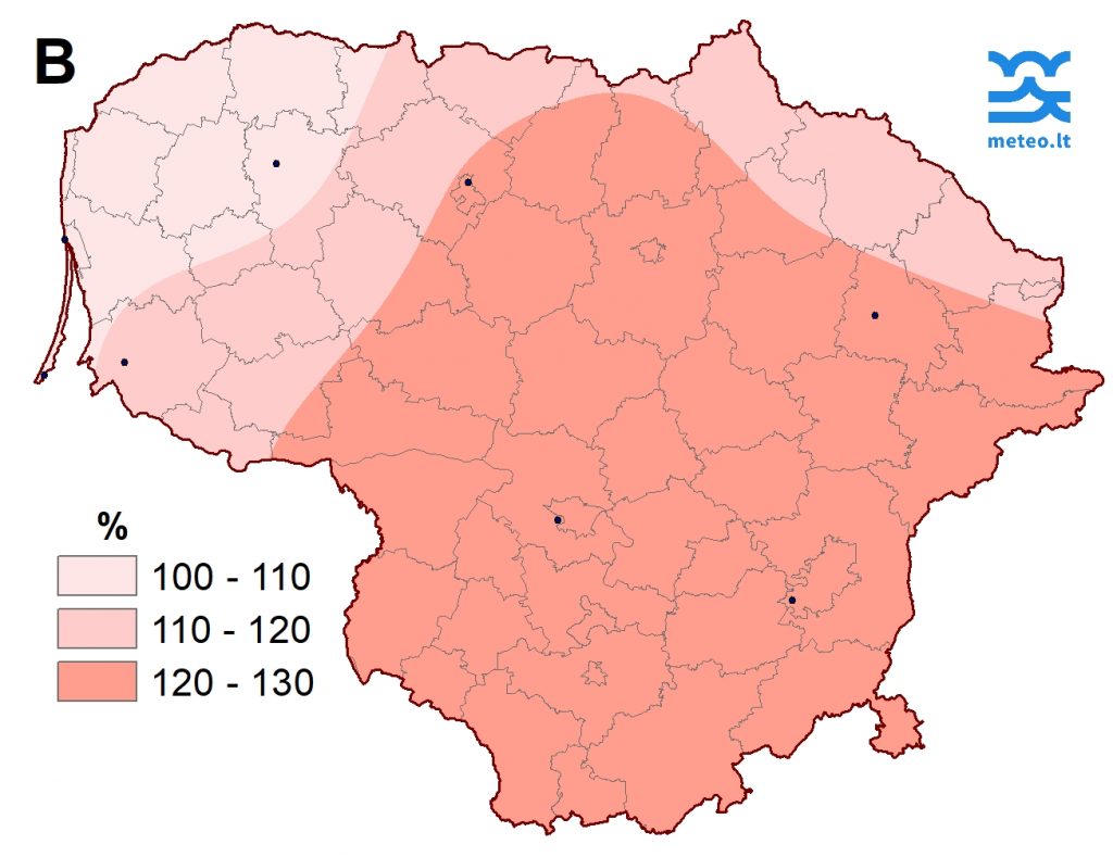 2 pav. Kovo mėnesio kritulių kiekis (A) ir nuokrypis nuo SKN (B)