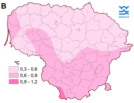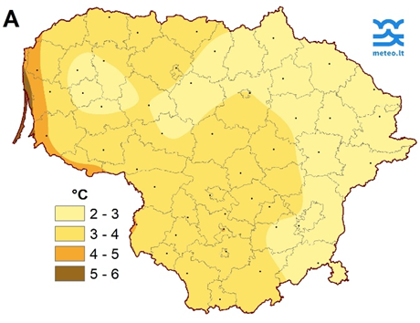 1 pav. Lapkričio mėnesio antrojo dešimtadienio vidutinė oro temperatūra (A) ir nuokrypis nuo SKN (B)