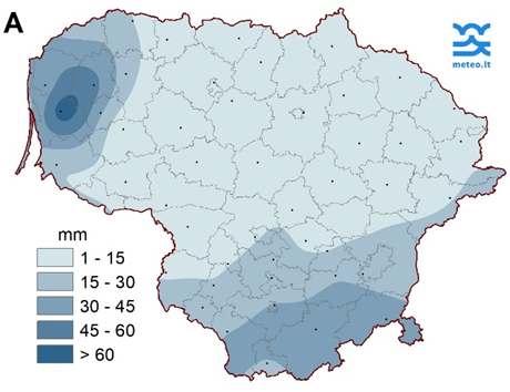 Antrąjį lapkričio dešimtadienį vidutinis kritulių kiekis Lietuvoje buvo 18,3 mm (91 % SKN) (2 pav.). Mažiausiai kritulių registruota Šiauliuose – 1,1 mm, daugiausiai Vėžaičuose – 65,5 mm. Lapkričio 15 d. Lazdijuose ir Varėnoje bei 19 d. vietomis Vakarų Lietuvoje registruoti pavojingi1 lietūs, gausiausi – Vėžaičiuose (41,8 mm/12 val.).