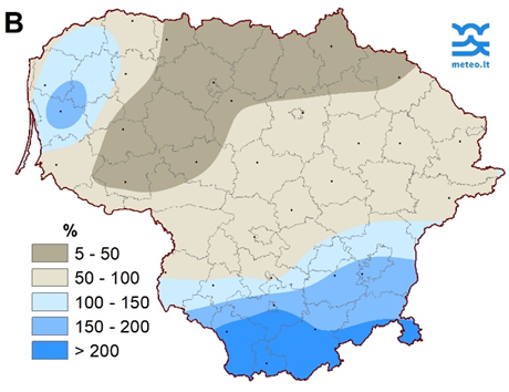 2 pav. Lapkričio mėnesio antrojo dešimtadienio kritulių kiekis (A) ir nuokrypis nuo SKN (B)