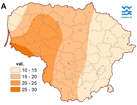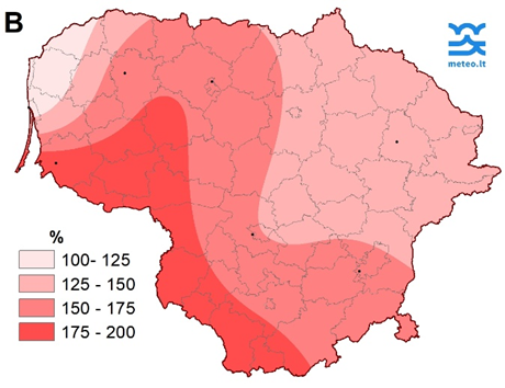 Vidutinis Saulės spindėjimo laikas Lietuvoje buvo 18 val. (150 % SKN): nuo 11,2 val. Utenoje iki 29,1 val. Nidoje (3 pav.).