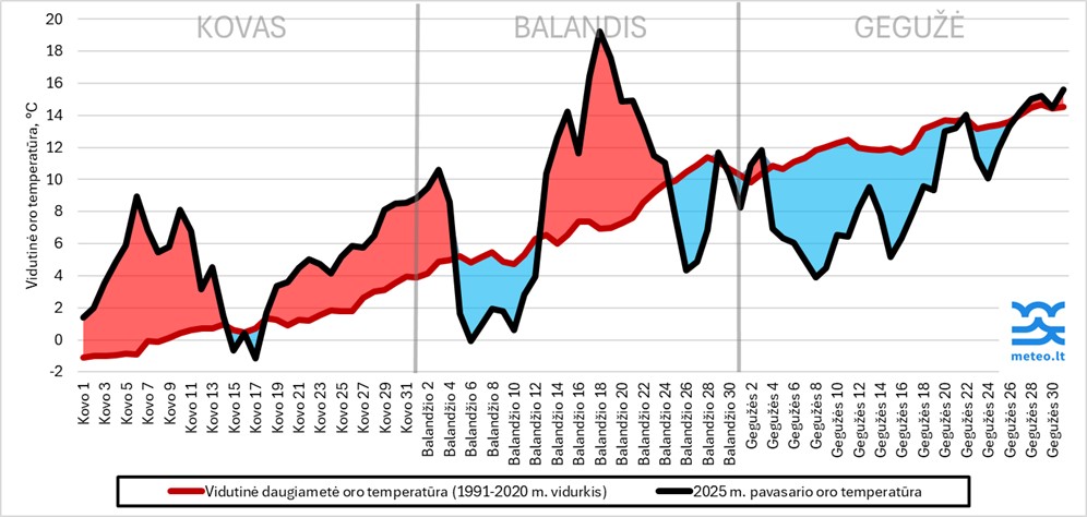 1 pav. 2025 m. pavasario (juoda kreivė) ir 1991–2020 m. (raudona kreivė) laikotarpio vidutinė oro temperatūra Lietuvoje. Raudona spalva rodo šiltesnius, o mėlyna – šaltesnius už daugiametį vidurkį laikotarpius.