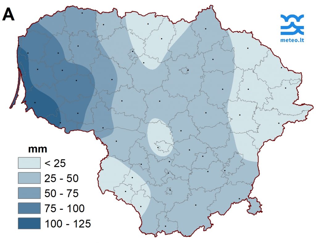 1 katastrofinis lietus – kai per 12 val. ar trumpesnį laikotarpį iškrenta daugiau nei 80 mm kritulių.
