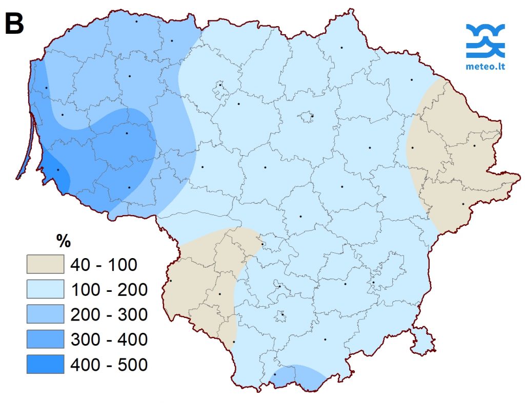 2 pav. Rugsėjo mėnesio antrojo dešimtadienio kritulių kiekis (A) ir nuokrypis nuo SKN (B)