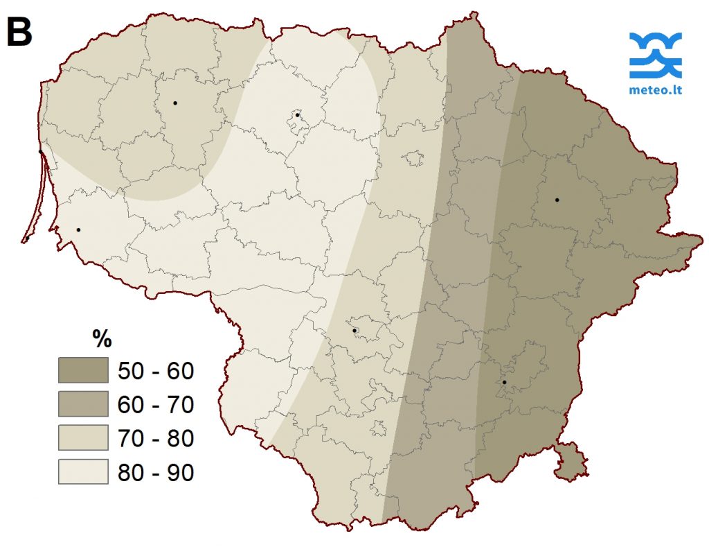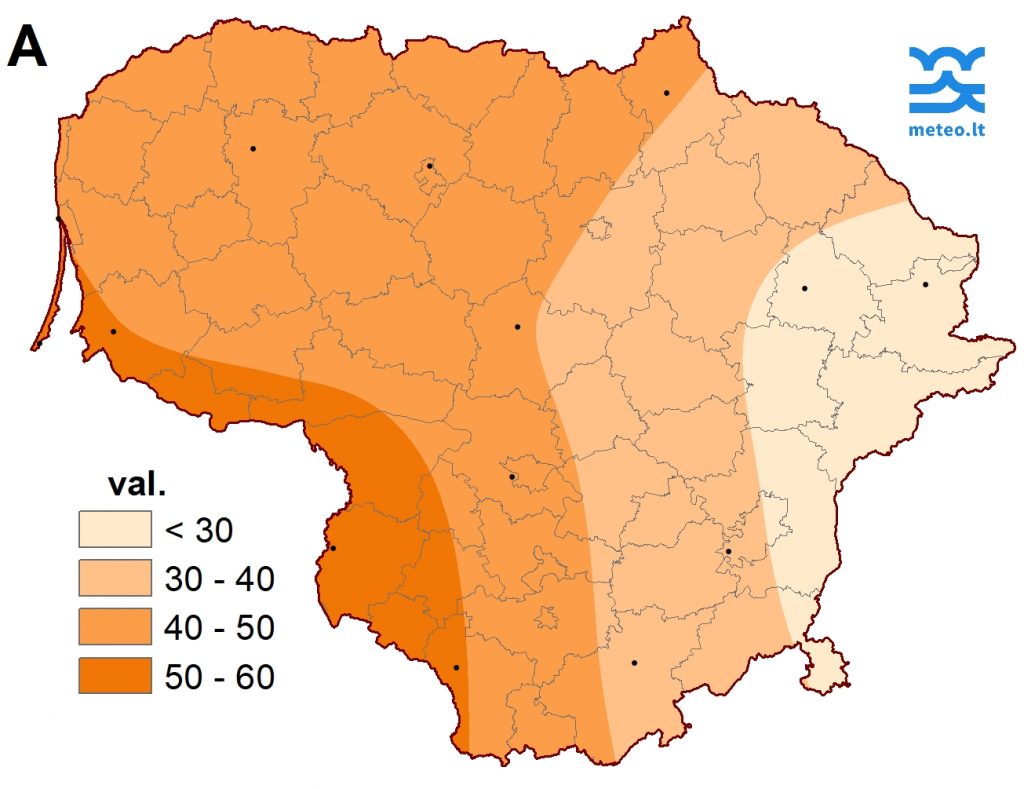 Vidutinis Saulės spindėjimo laikas Lietuvoje buvo 43,3 val. (75 % SKN): nuo 27,9 val. Dūkšte iki 57,9 val. Kybartuose (3 pav.).