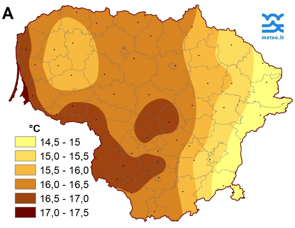 Rugsėjo antrojo dešimtadienio vidutinė oro temperatūra Lietuvoje buvo 16,1 °C (teigiama 3,4° anomalija) (1 pav.). Žemiausia oro temperatūra 8,1 °C išmatuota rugsėjo 18 d. Varėnoje ir Joniškyje, aukščiausia – 25,6 °C rugsėjo 11 d. Dotnuvoje.