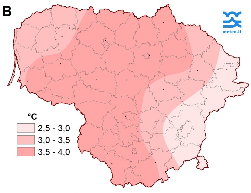 1 pav. Rugsėjo mėnesio antrojo dešimtadienio vidutinė oro temperatūra (A) ir nuokrypis nuo SKN (B)
