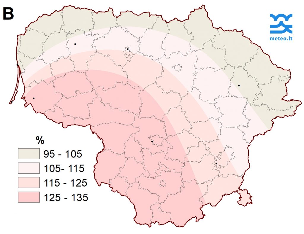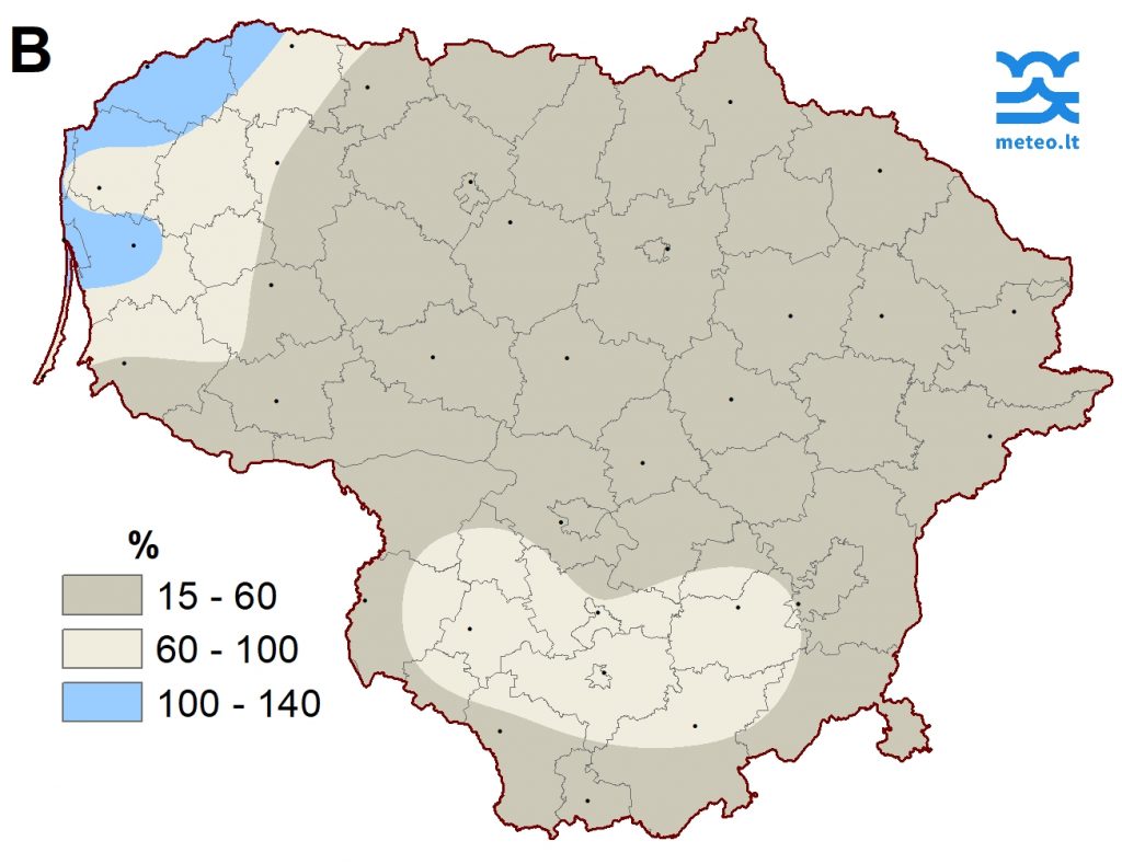 2 pav. Spalio mėnesio pirmojo dešimtadienio kritulių kiekis (A) ir nuokrypis nuo SKN (B)