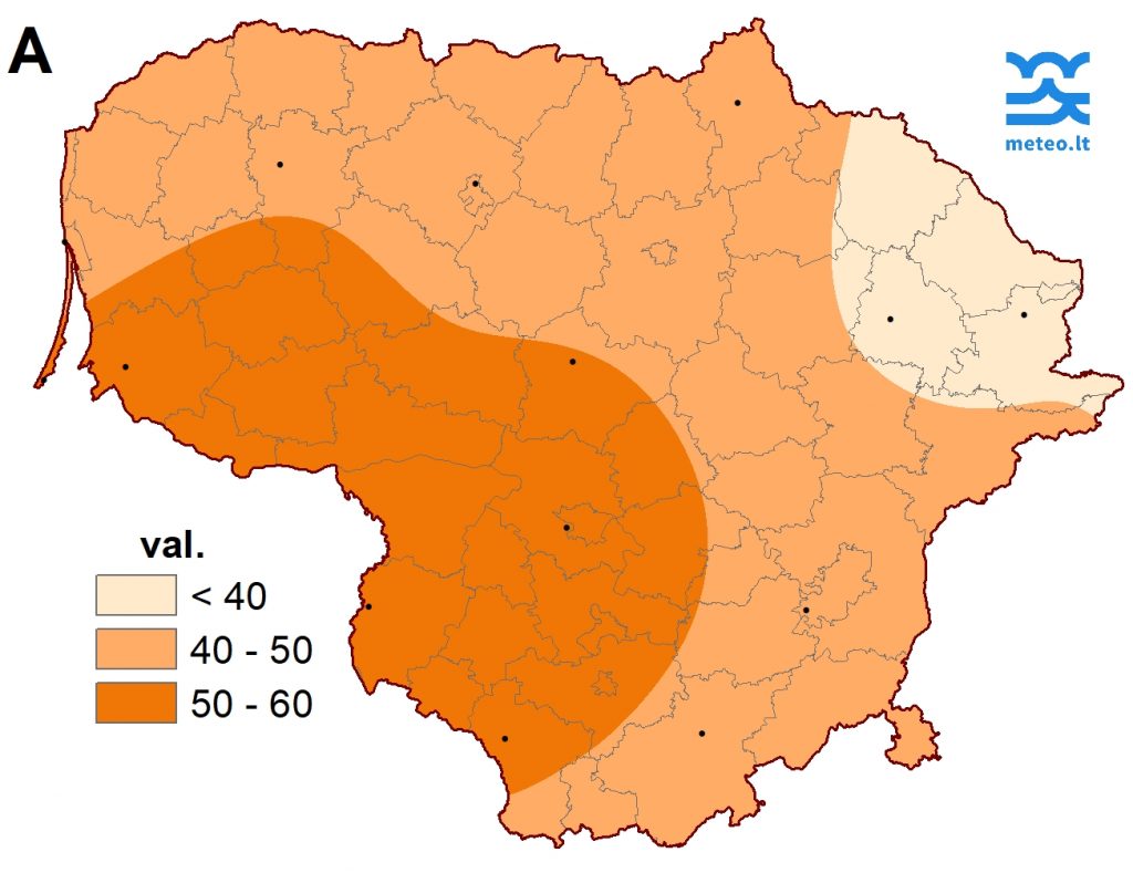 Vidutinis Saulės spindėjimo laikas Lietuvoje buvo 47,7 val. (114 % SKN): nuo 38,9 val. Utenoje iki 57,9 val. Šilutėje (3 pav.).