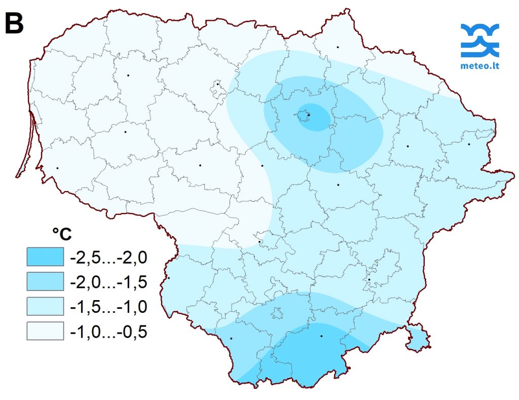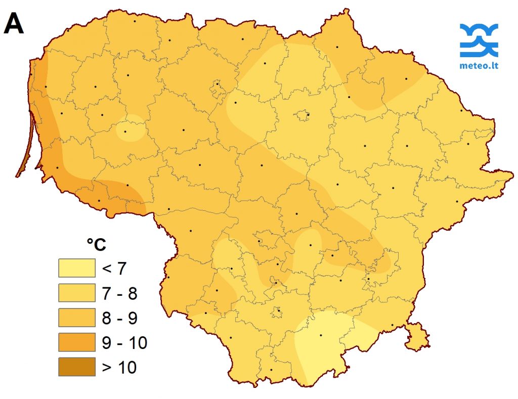 1 pav. Spalio mėnesio pirmojo dešimtadienio vidutinė oro temperatūra (A) ir nuokrypis nuo SKN (B)
