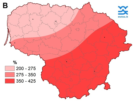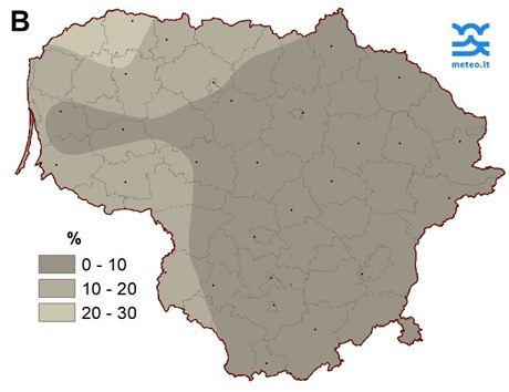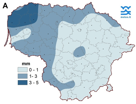 2 pav. Sausio mėnesio antrojo dešimtadienio kritulių kiekis (A) ir nuokrypis nuo SKN (B)