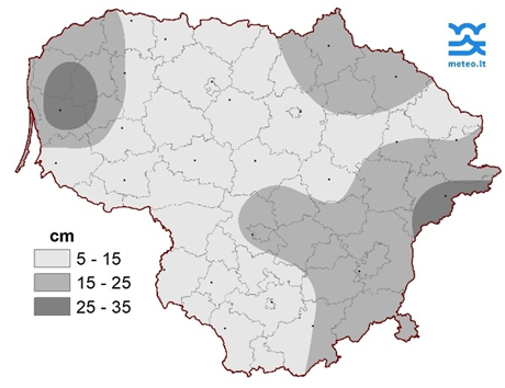Dešimtadienio paskutinę dieną (sausio 20 d.), storiausia sniego danga buvo Vėžaičiuose (34 cm) ir Švenčionyse (28 cm), ploniausia – Kybartuose (5 cm) ir Marijampolėje (6 cm) (3 pav.).