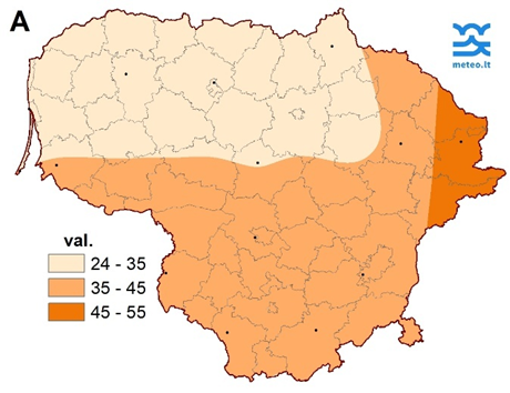 4 pav. Sausio mėnesio antrojo dešimtadienio Saulės spindėjimo trukmė (A) ir nuokrypis nuo SKN (B)