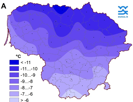 Vasario mėn. antrojo dešimtadienio vidutinė oro temperatūra Lietuvoje buvo –8,5 °C (neigiama 6,0° anomalija) (1 pav.). Tai trečias pagal šaltumą antrasis vasario dešimtadienis Lietuvoje XXI amžiuje. Šalčiau buvo 2011 m. (-11,4 °C) ir 2021 m. ( -9,0 °C).