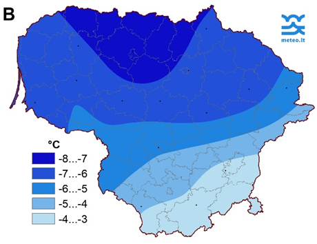 1 pav. Vasario mėnesio antrojo dešimtadienio vidutinė oro temperatūra (A) ir nuokrypis nuo SKN (B)