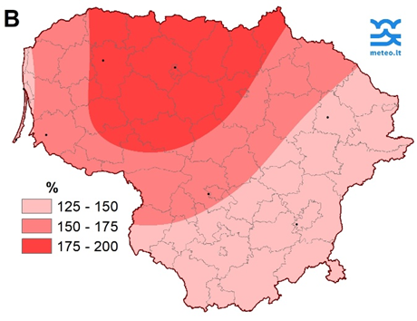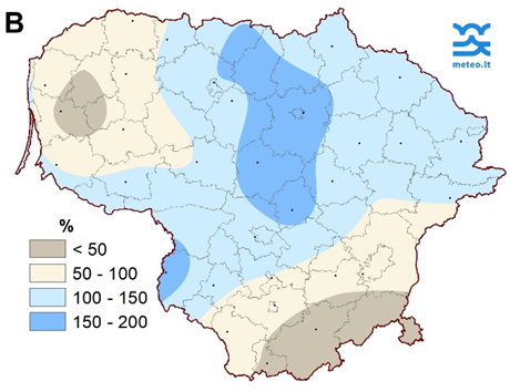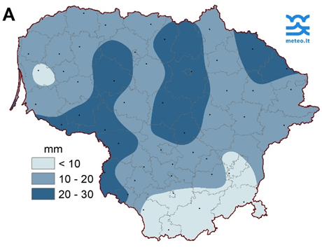 2 pav. Vasario mėnesio antrojo dešimtadienio kritulių kiekis (A) ir nuokrypis nuo SKN (B)