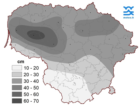 Dešimtadienio paskutinę dieną (vasario 20 d.) storiausia sniego danga buvo Laukuvoje (66 cm), ploniausia – Lazdijuose (12 cm) (3 pav.).