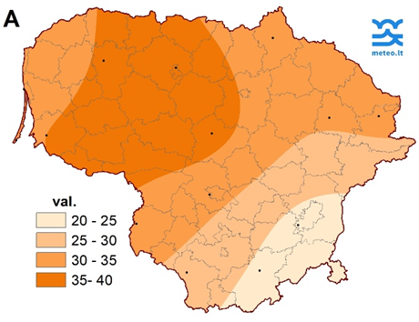 4 pav. Vasario mėnesio antrojo dešimtadienio Saulės spindėjimo trukmė (A) ir nuokrypis nuo SKN (B)