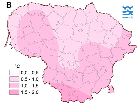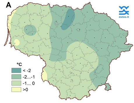 1 pav. Vasario mėnesio trečiojo dešimtadienio vidutinė oro temperatūra (A) ir nuokrypis nuo SKN (B)