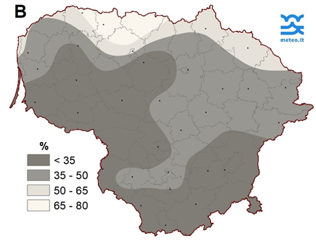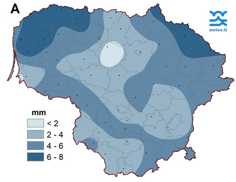 2 pav. Vasario mėnesio trečiojo dešimtadienio kritulių kiekis (A) ir nuokrypis nuo SKN (B)