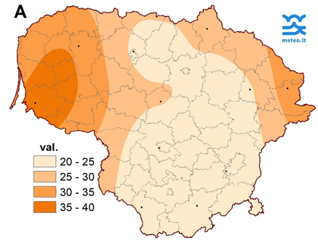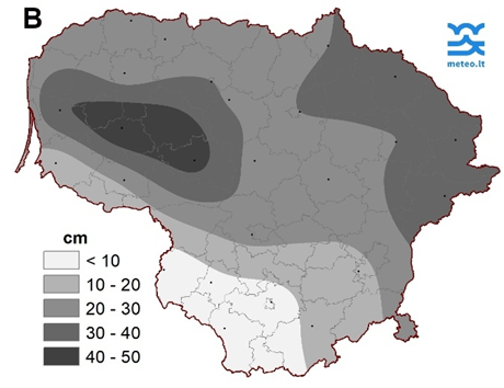 Dešimtadienio paskutinę dieną (vasario 28 d.) storiausia sniego danga buvo Laukuvoje (48 cm), ploniausia – Kybartuose (3 cm) (3 pav.).