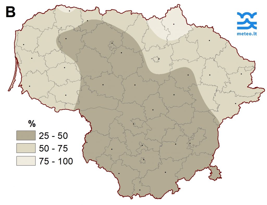 2 pav. Gruodžio mėnesio kritulių kiekis (A) ir nuokrypis nuo SKN (B)