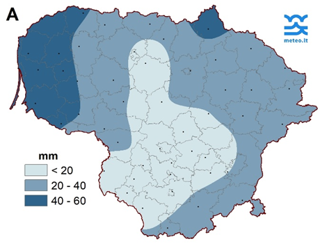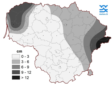 Mėnesio pabaigoje beveik visoje Lietuvoje susidarė sniego danga, storiausia paskutinę mėnesio dieną ji buvo Švenčionyse (13 cm) ir Mažeikiuose (12 cm) (3 pav.).