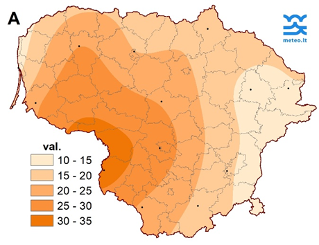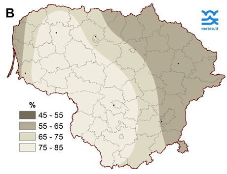 4 pav. Saulės spindėjimo trukmė gruodžio mėnesį (A) ir nuokrypis nuo SKN (B)