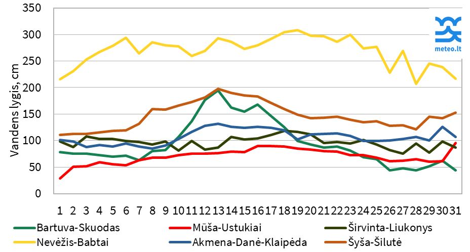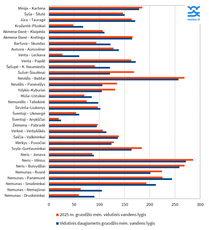 Aukštesnis nei vidutinis daugiametis vandens lygis stebėtas Tauragno ežere – 22 cm. 2 cm aukštesnis nei įprasta gruodį vandens lygis stebėtas ir Kauno mariose ties Birštono ir Darsūniškio vandens matavimo stotimis.