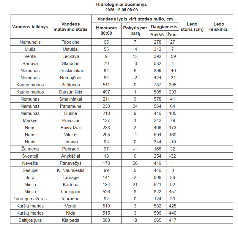 Operatyvi hidrologijos tinklo informacija (dar neįvertinus duomenų patikimumo). Oficialią informaciją galima gauti Lietuvos hidrometeorologijos tarnybos Hidrologinių stebėjimų skyriuje.