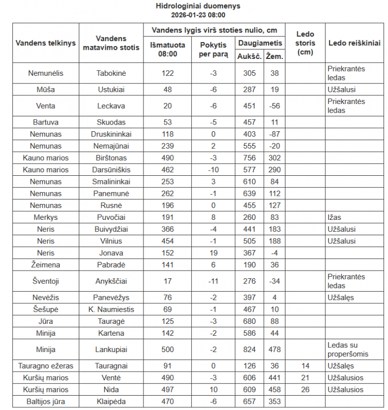 Operatyvi hidrologijos tinklo informacija (dar neįvertinus duomenų patikimumo). Oficialią informaciją galima gauti Lietuvos hidrometeorologijos tarnybos Hidrologinių stebėjimų skyriuje.